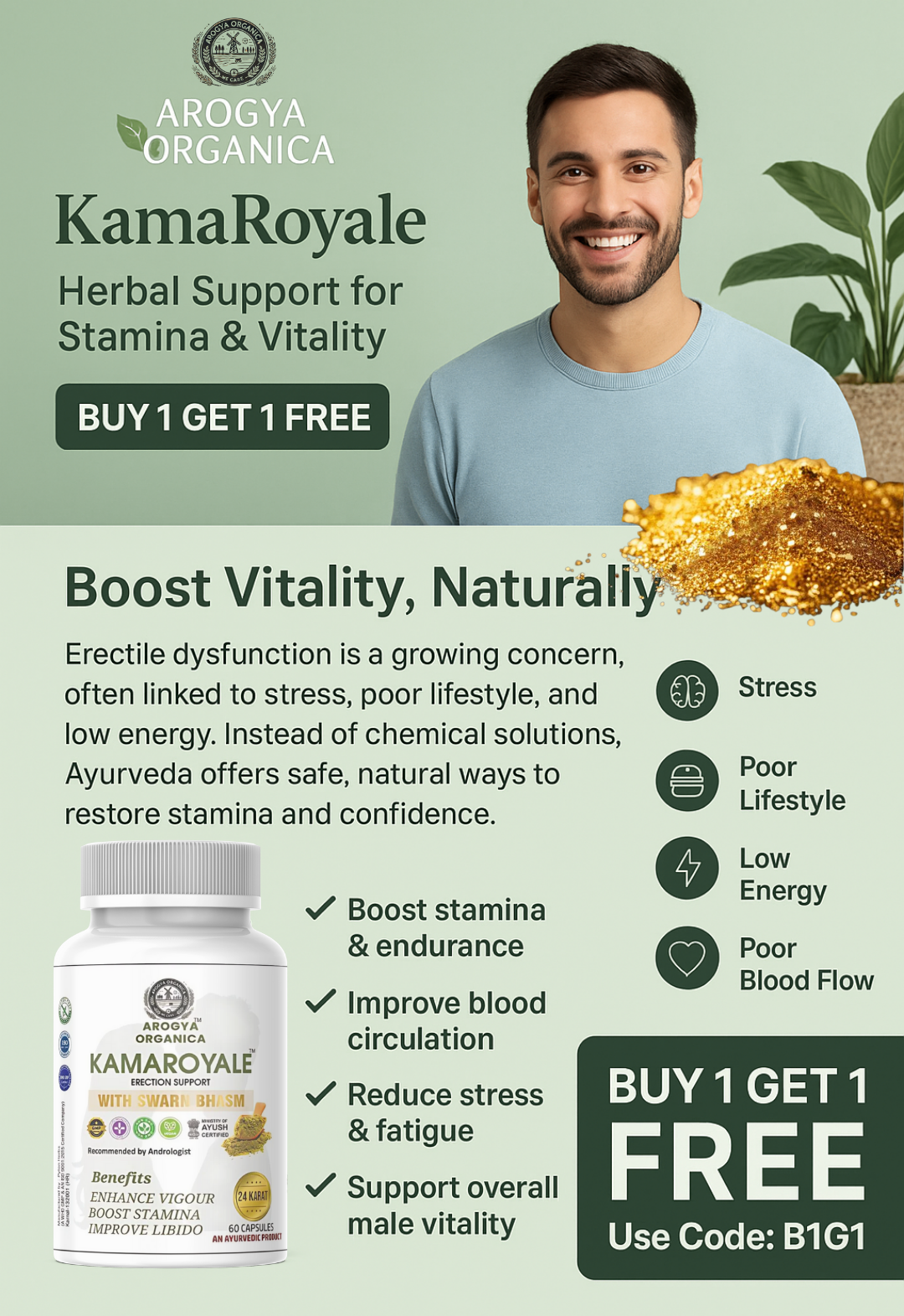 With KamaRoyale, men can naturally regain energy, confidence, and wellness. Don’t miss the chance – grab your Buy 1 Get 1 Free offer today!